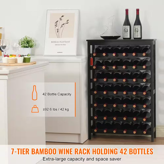42-Bottle Bamboo Wine Rack, 7-Tier Freestanding Storage with Table Top, Wobble-Free Display Shelf for Kitchen, Black